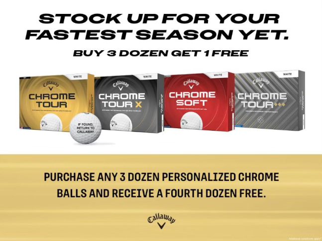 Buy 3 dozen personalized Chrome Soft, Chrome Tour, Chrome Tour Triple Diamond, or Chrome Tour X Golf Balls and receive a fourth personalized dozen FREE! Plus, orders receive free personalization.